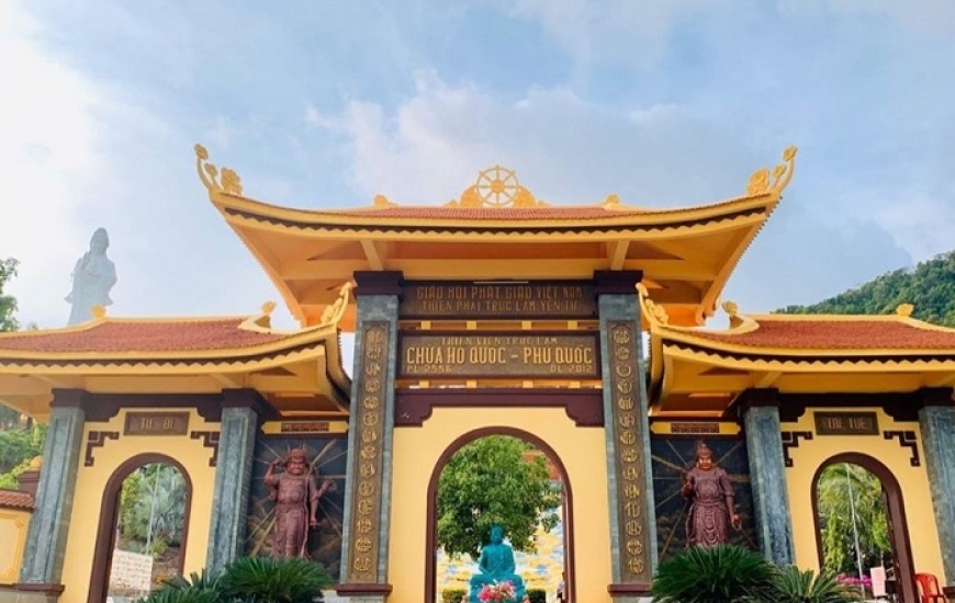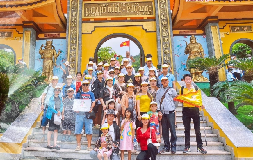 Đoàn lên xe viếng Chùa Hộ Quốc còn gọi là Thiền Viện Trúc Lâm Hộ Quốc là một trong hệ thống Thiền Viện Trúc Lâm trong cả nước, đây cũng là một địa điểm du lịch tham quan tâm linh mới của Phú Quốc.